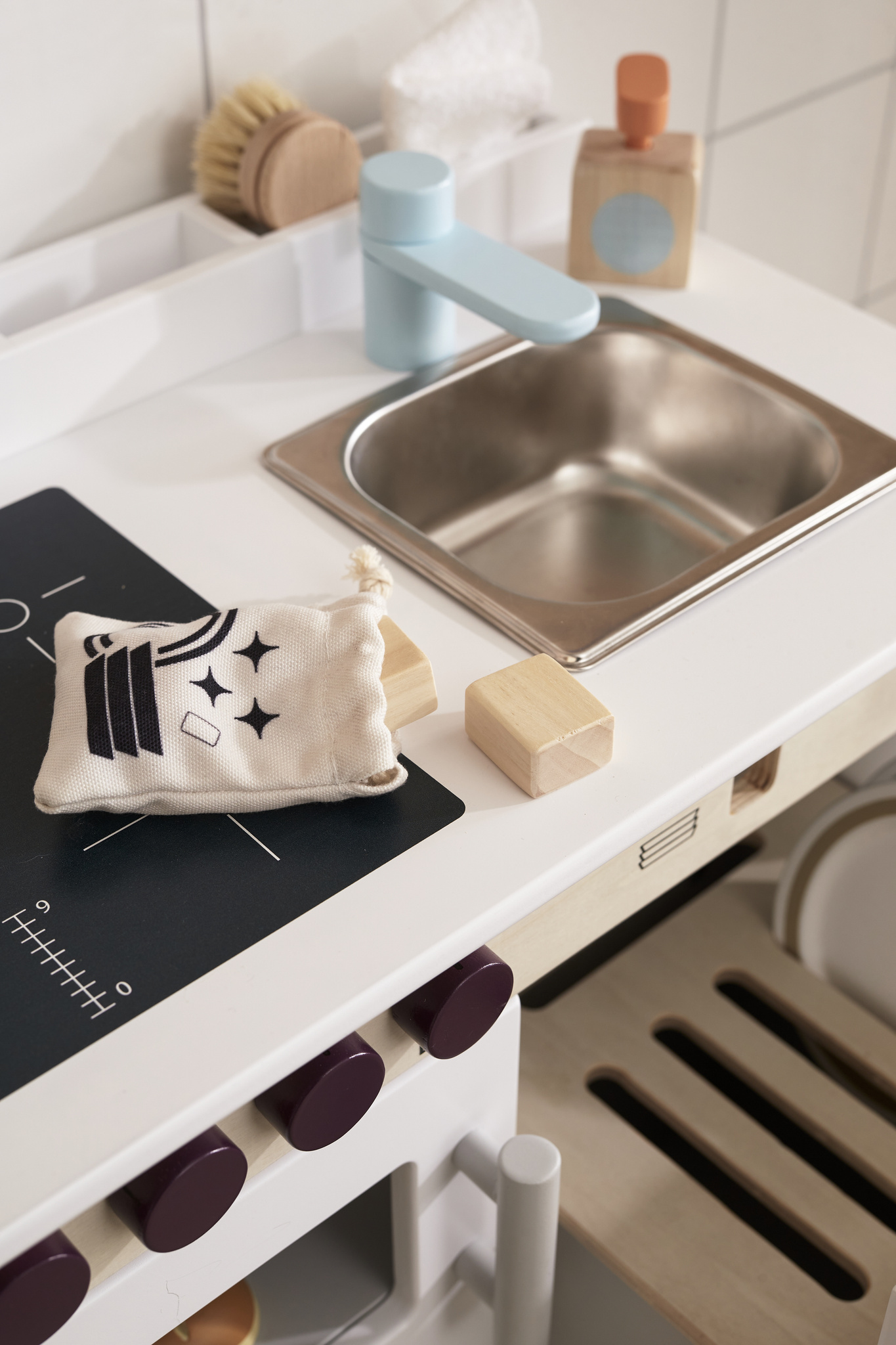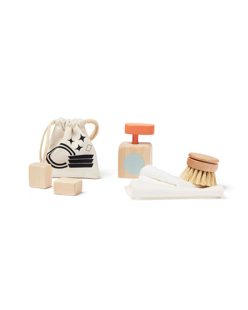 This contemporary kitchen in FSC-certified wood is fully equipped with a dishwasher, oven, sink, shelves, and an integrated cooker hood. Place some plates and cutleries in the dishwasher stand and put the tablet in the slot at the front. Turn the clicking button, and you're done. And there is a dish brush and soap for any tuff stains. On the side, you'll find three hangers to put your dishtowel on. The dishwasher and the space under the oven can also be used as practical storage when you're done playing. Includes: Kitchen with dishwasher, a towel, a dish brush, a baking plate, a liquid soap dispenser with pump function and two dishwasher tablets in a storage bag.