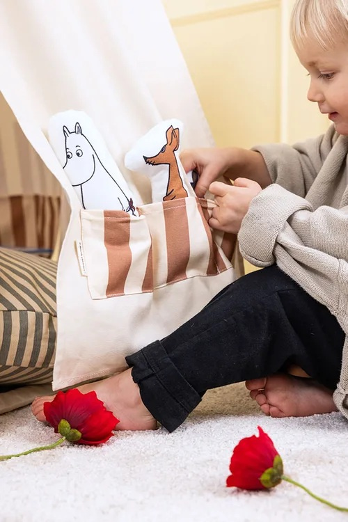 The tent with practical pockets (inspired by Moominmother's apron, of course) both outside and inside, can accommodate small books or toys, so you can always have what you need in your cozy place.