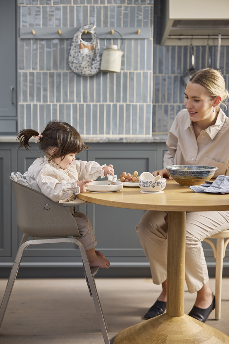 The feeding chair from Elodie is available in fashionable colors and a wide range of unique pillows. The cushions can be conveniently turned over, which reduces the need to wash frequently and provide even greater flexibility to achieve a personalized style. Elodie bibs, plates, bowls and cutlery from the EAT collection can be matched to the highchair, thus creating a coherent, elegant whole.