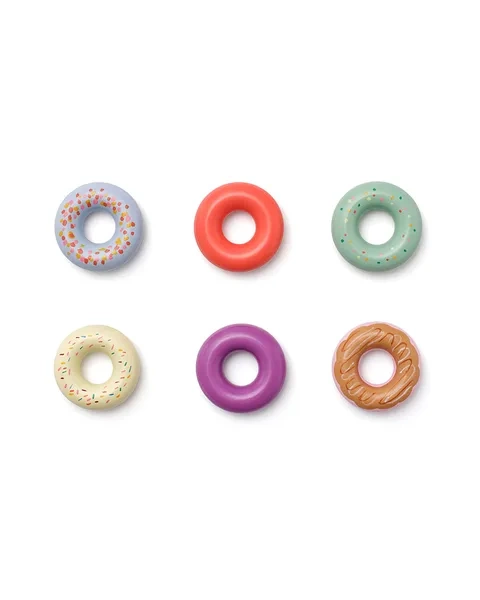 - 6 wooden doughnuts with colorful toppings