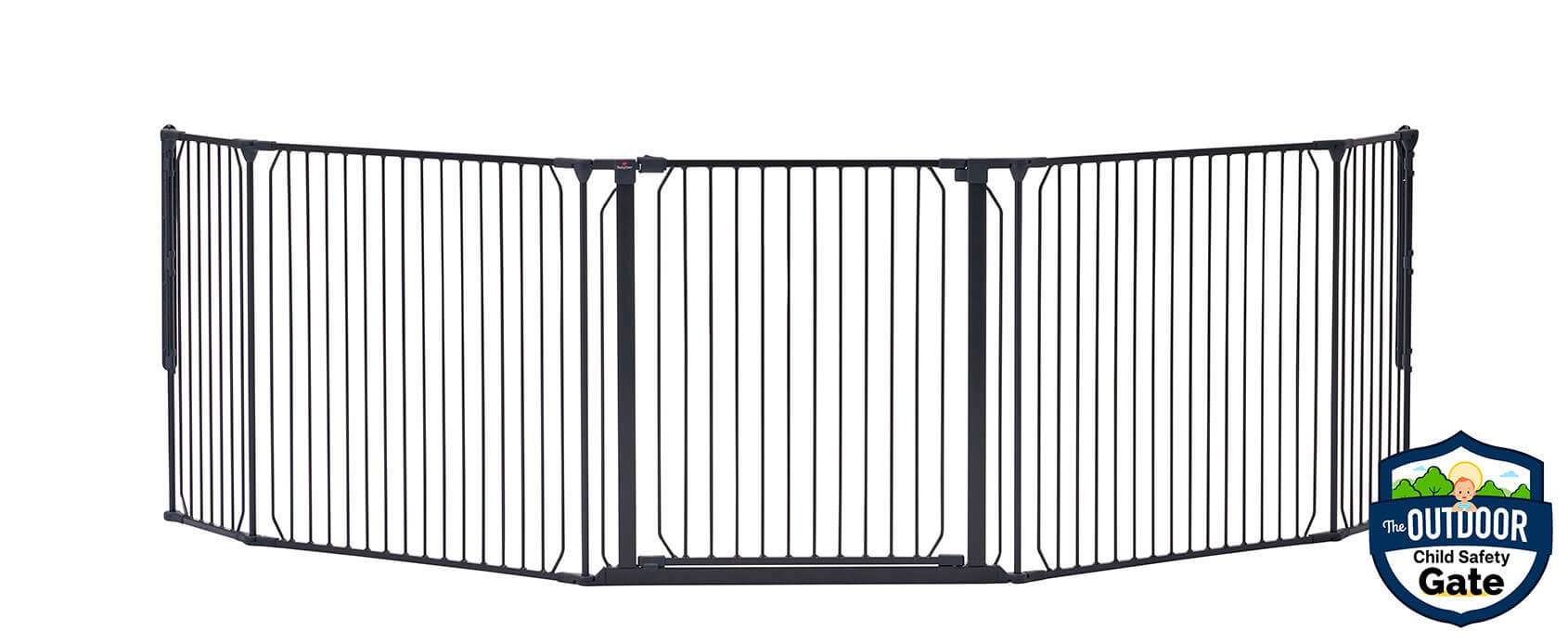 - Wall-mounted safety gate for openings 90–278 cm. Features a wide, two-way gate, adjustable panel angles, and can be configured as a spacious playpen.