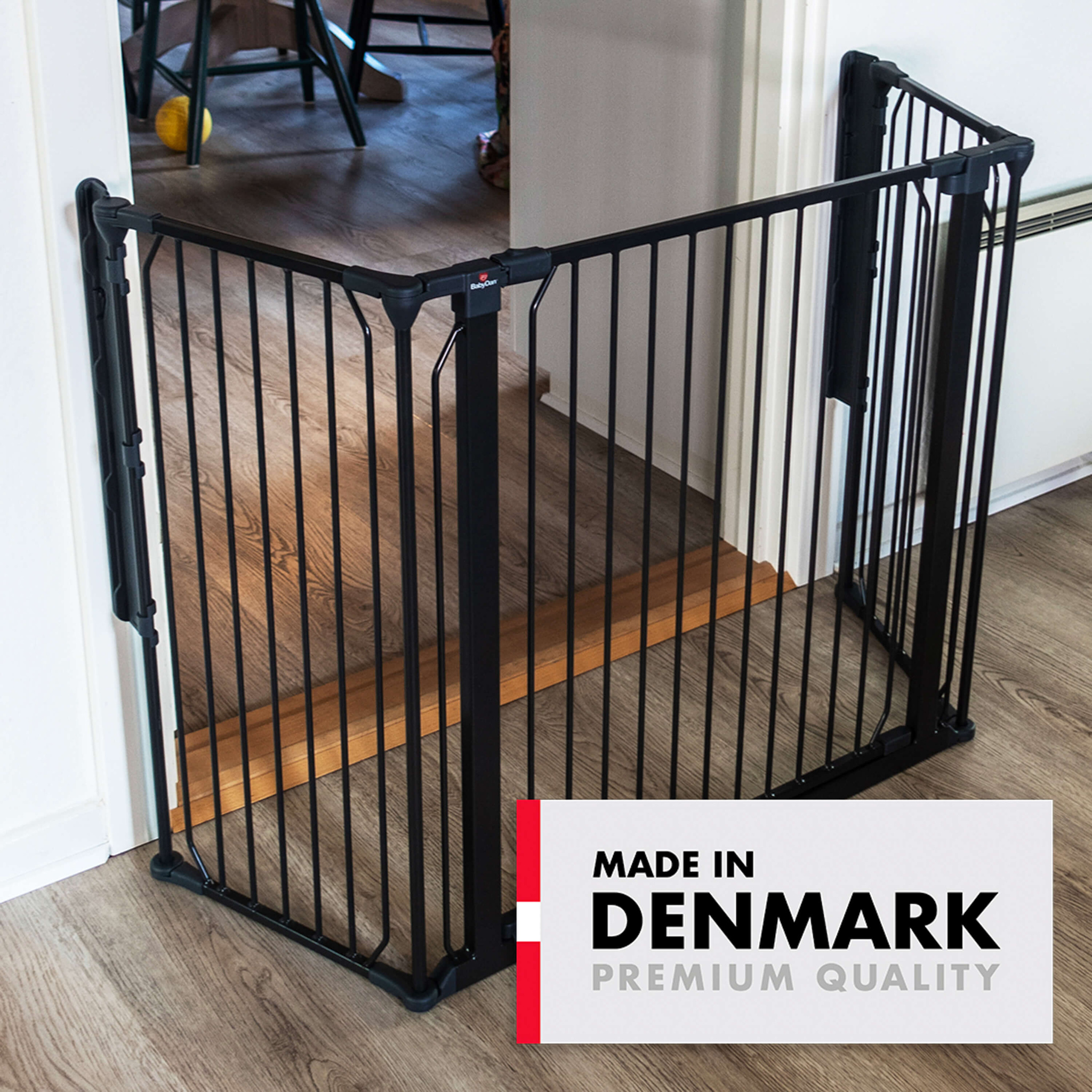 - All gates are made in Denmark from certified, child-safe materials.