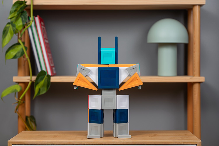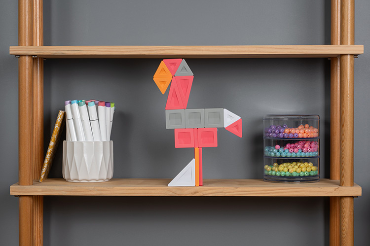 The set includes a dynamic selection of shapes in six refined colours: squares, rectangles, three types of triangles, plus post and plank pieces to expand design potential. Extra-strong, self-aligning magnets let you pick up and move finished constructions without compromising stability.