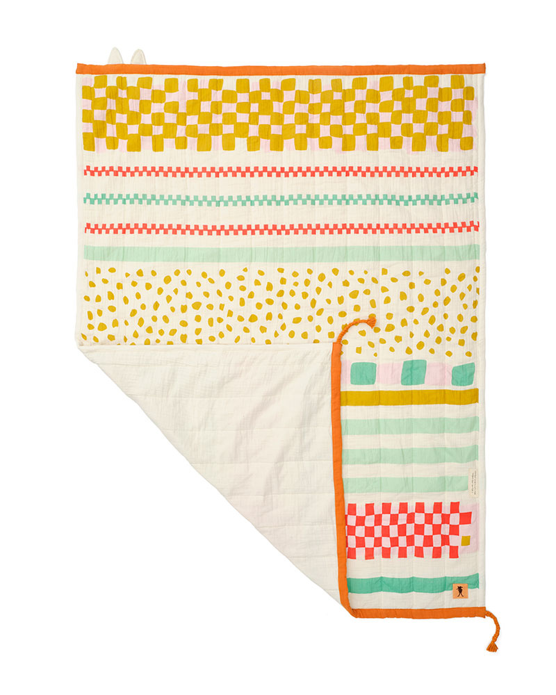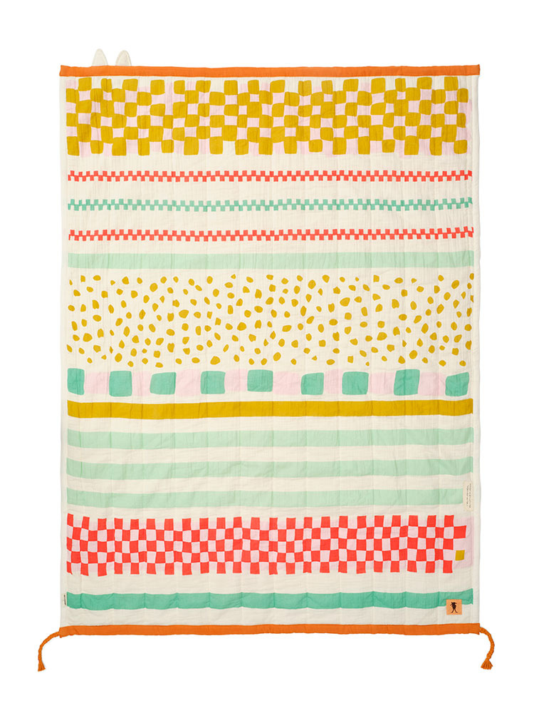 These words perfectly capture the unique combination of strength and warmth that characterizes Pippi Longstocking. This versatile blanket carries that same joyful spirit. Made from soft, layered cotton muslin—a light and breathable fabric—with a gentle filling of recycled polyester, it provides the perfect amount of warmth for a nap, bedtime, or relaxing on the sofa.