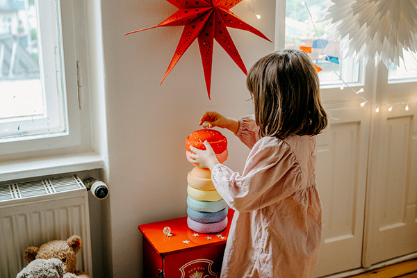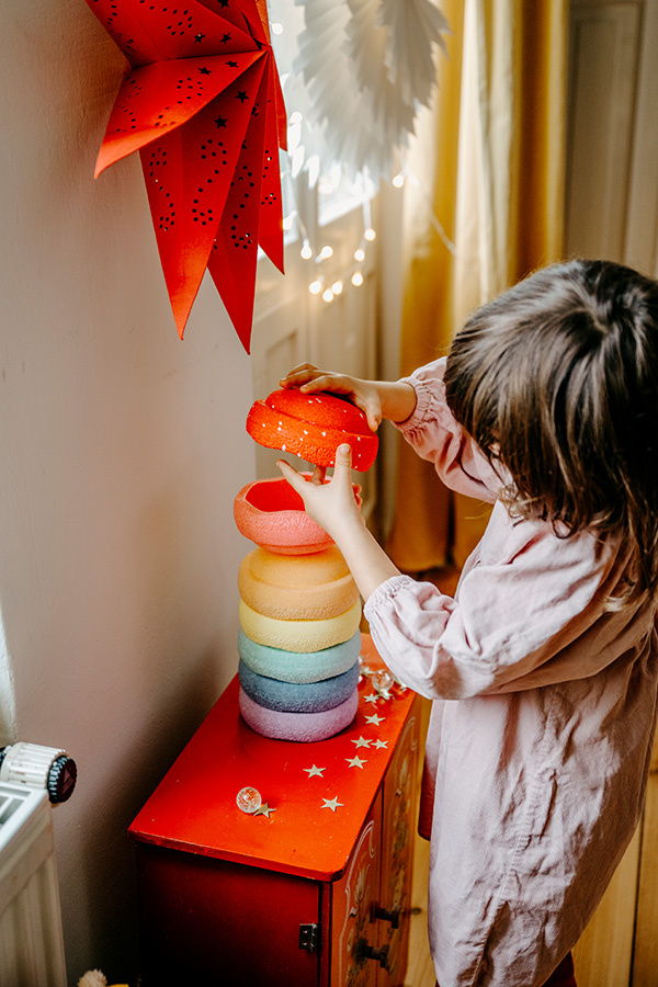 Stapelstein® Mini Rainbow is a smaller, more handy version of the iconic stones, created with little hands and new play possibilities in mind. Their compact size is perfect for sorting, learning colours, or building on smaller surfaces, such as a table. Despite their smaller dimensions, the Mini elements retain all the functions of their larger counterparts – they inspire movement, balance, and creative play.