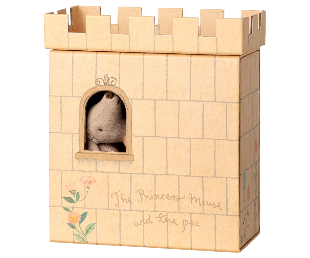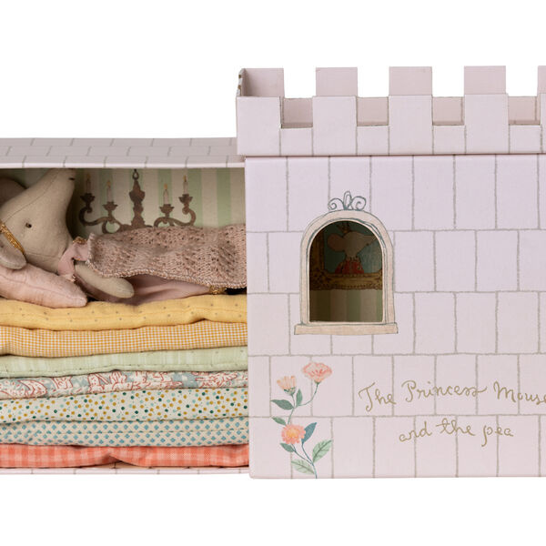 Meet the Big Sister Mouse in one of her most iconic roles – the Princess and the Pea. This charming Maileg set is a tribute to the classic fairytale, bringing the magic of the story straight into your child's room. In a beautiful cardboard castle bed, under a pile of patterned mattresses, a small, green "pea" is hidden.