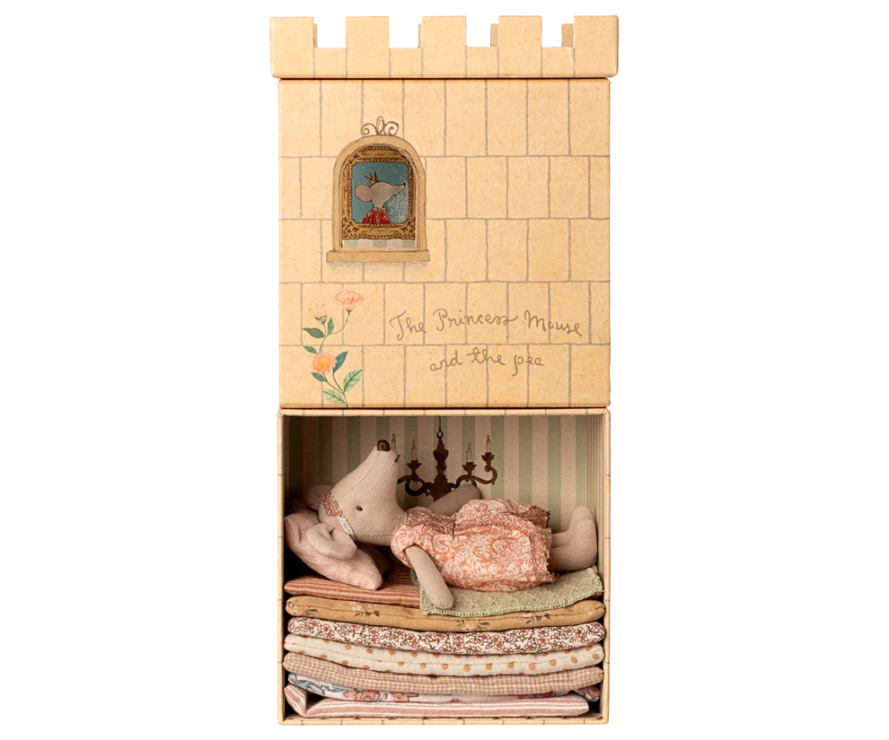 - A fairytale Maileg "Princess and the Pea" set with Big Sister (approx. 13 cm). Includes a princess mouse, a cardboard castle bed, a stack of mattresses, and, of course, a pea. Perfect for role-playing.