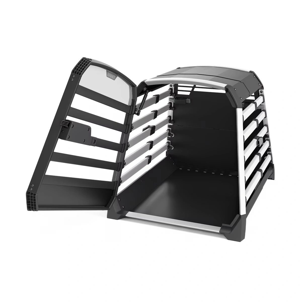 The crate is equipped with an emergency escape hatch that allows it to be opened from the rear seat.